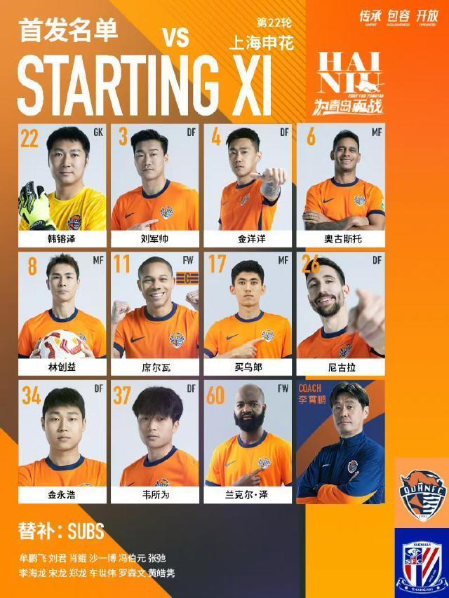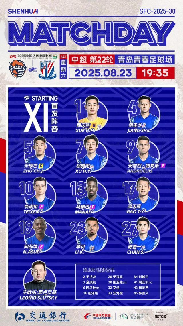 北京时间8月23日19:35,中超第22轮,青岛海牛迎战上海申花。赛前双方公布首发名单。